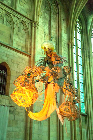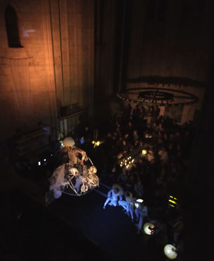 A sudden bright stage light. We look high up.