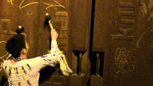 The door bounced back and forth. The moment the percussionist hits the metal door with a hammer, there is feedback from the other side of the door. The metal door is made in the form of a book. The book gate is the entrance of the Dominican Bookstore.